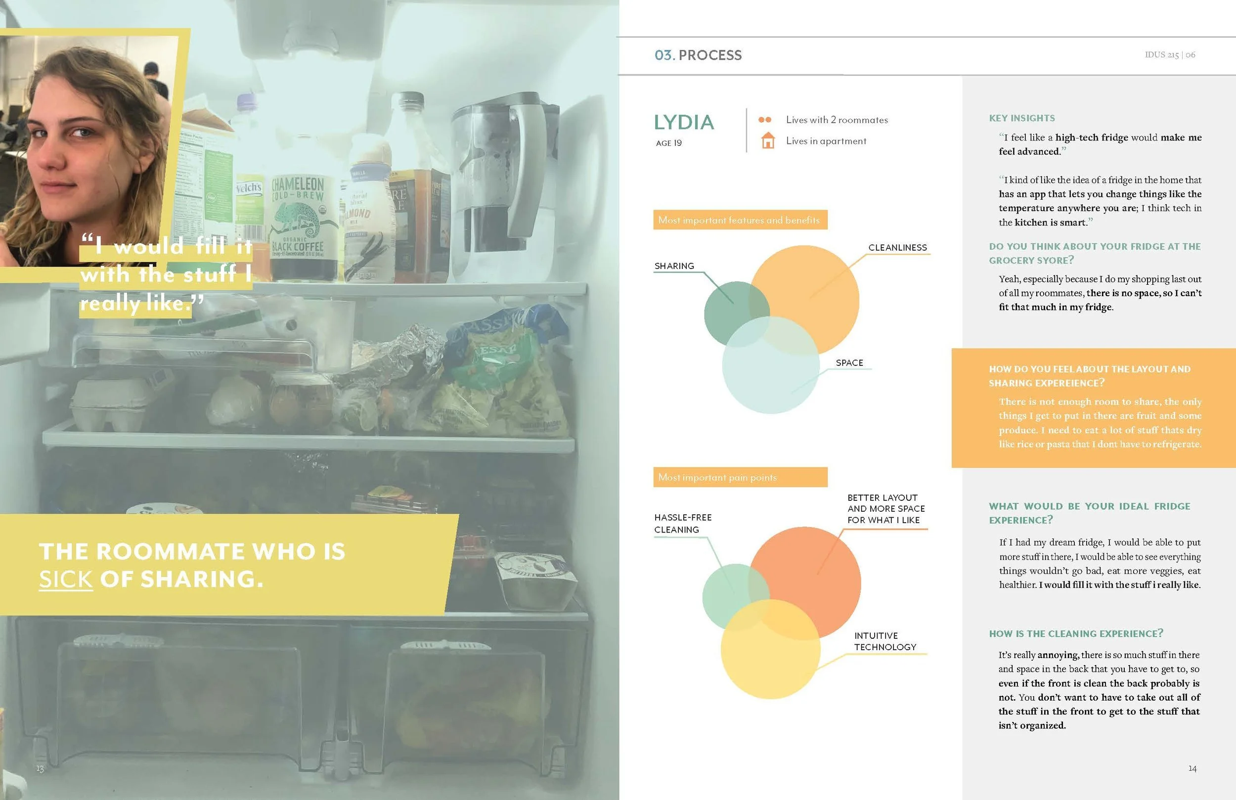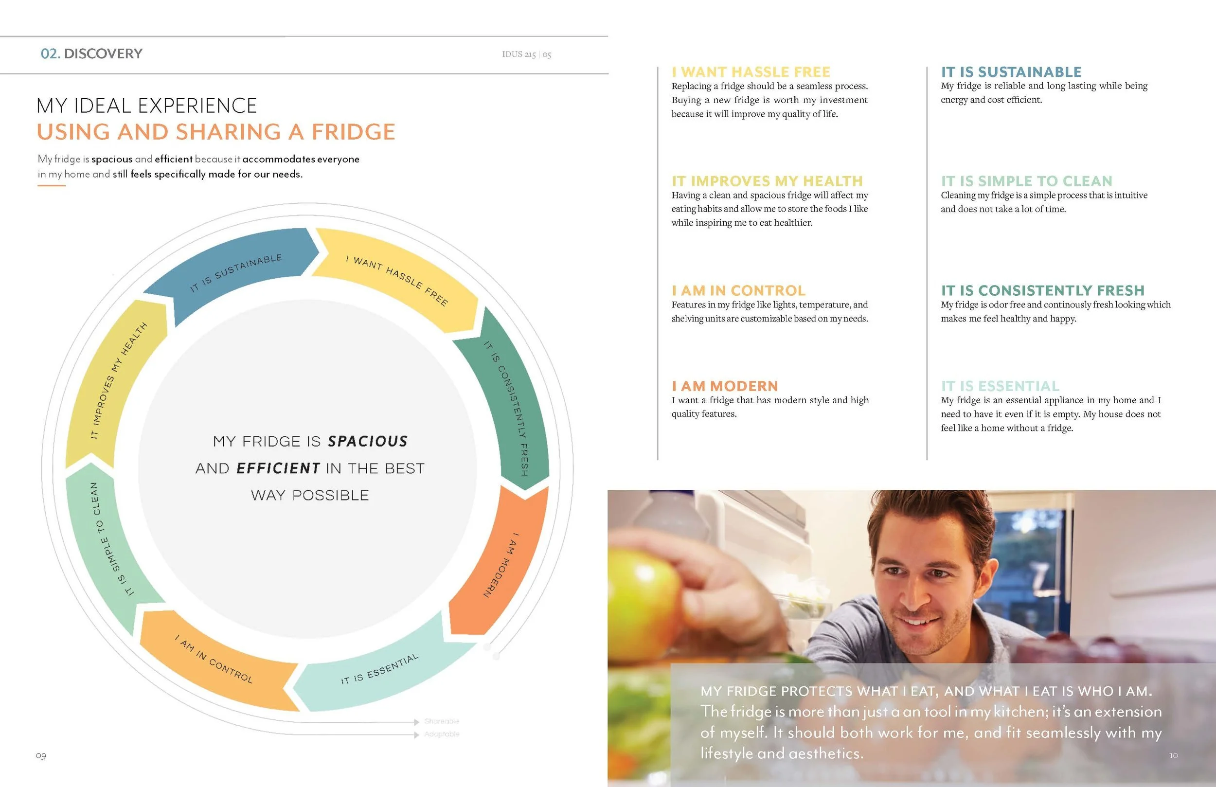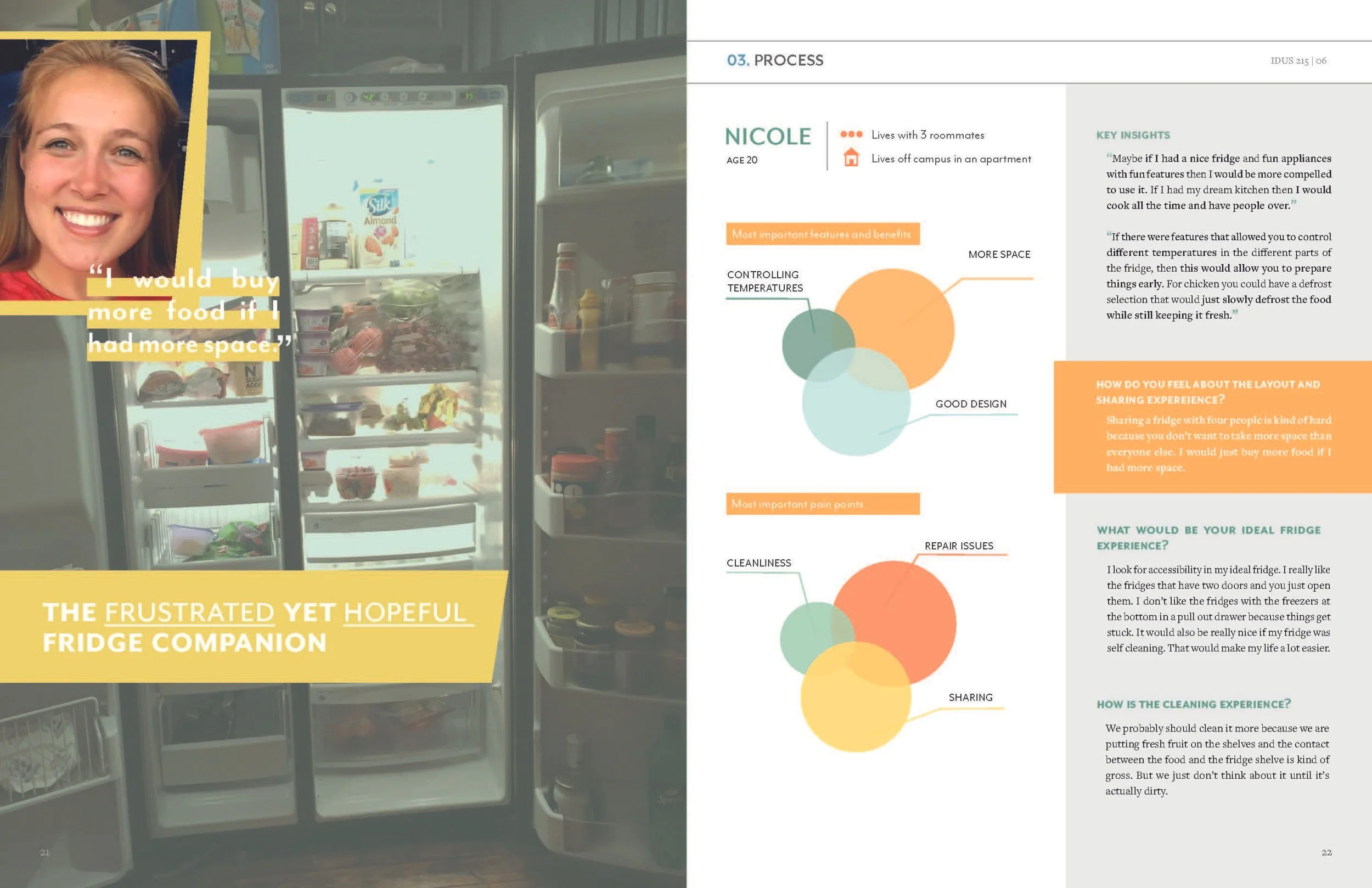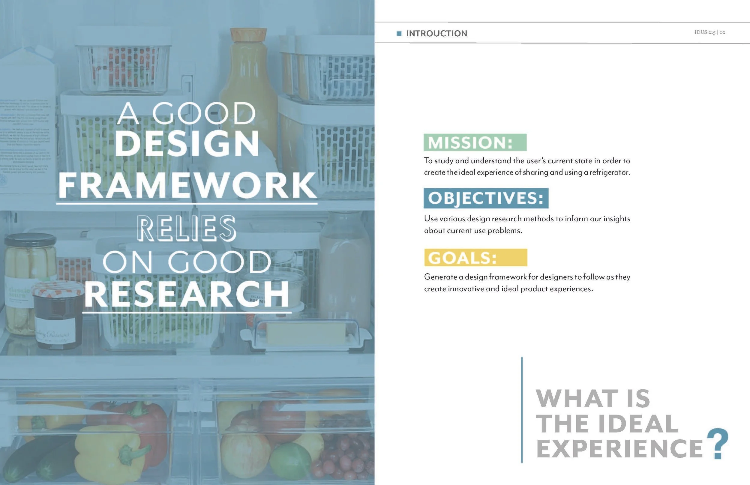 This magazine reveals the studies that were found while conducting contextual research. The information provides an understanding of the user’s current experience and frames ideas to create the ideal experience of sharing and using a refrigerator.