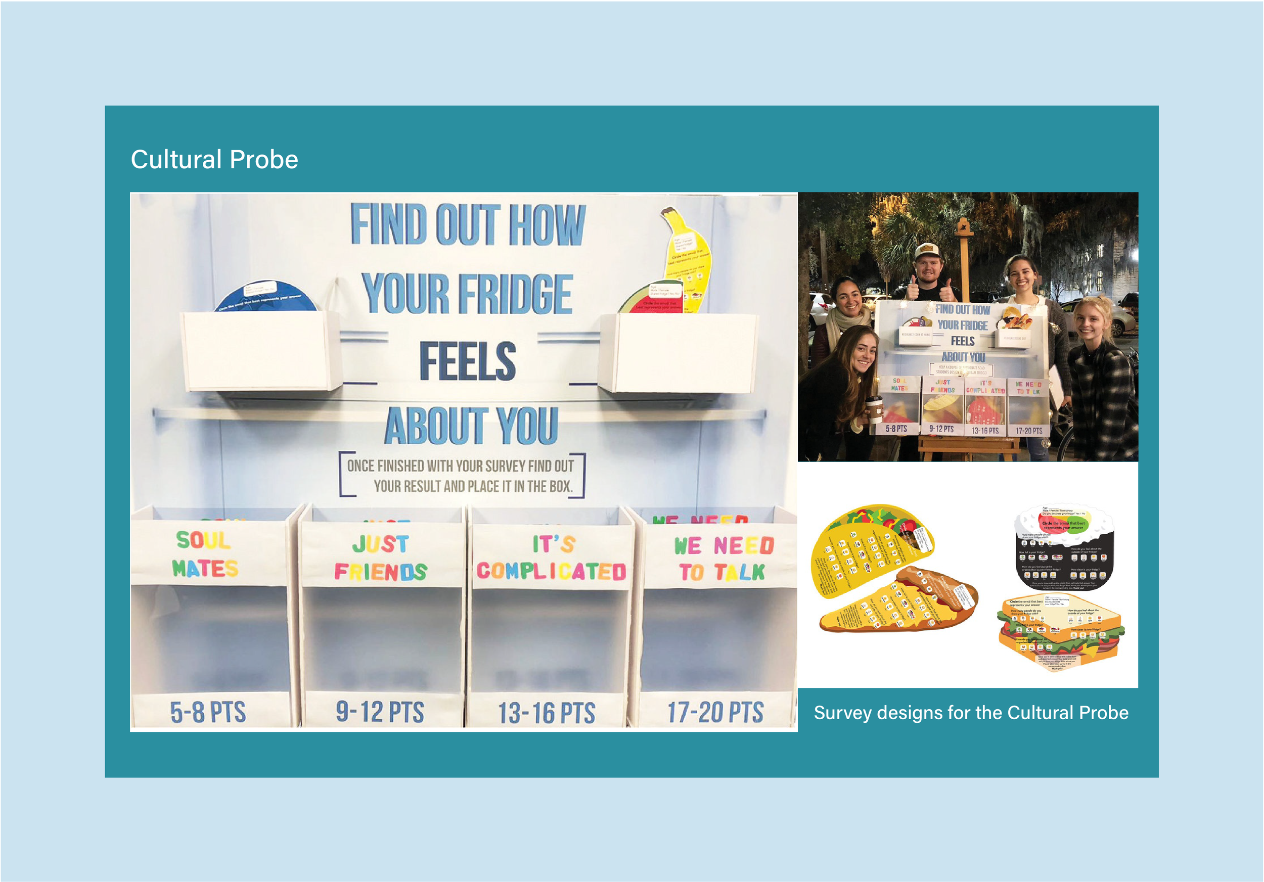 Food shaped survey sheets were used to capture cultural probe participants responses. If a participant felt they ate at home more often they would take a fruit shaped survey sheet. If they felt they dined out more often they would take a fast food shaped survey sheet. My goal in making the surveys was to create a playful and inviting questionnaire, thus the use of emojis and color full design.