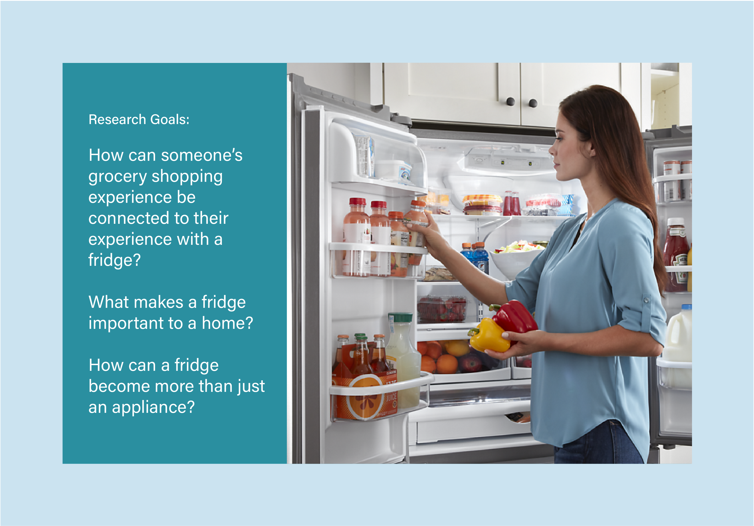 After conducting several methods of ethnographic research we discovered that grocery store companies would be most interested in design research about the ideal experience of using and sharing refrigerator. People’s habits with buying food begin with the experience they are having at the grocery store. They continue through the life span of the food items they have bought. The better people feel about their fridge the more the are going to buy at the grocery store.